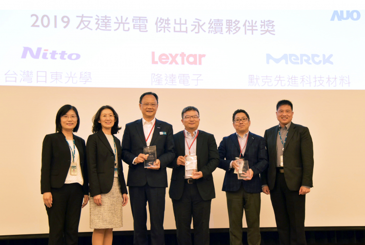 友達肯定供應商永續(xù)經營的優(yōu)異表現,頒發(fā)傑出永續(xù)夥伴獎 (圖左到右:友達光電永續(xù)長古秀華、友達光電供應鏈總部資深協(xié)理吳宜芳、默克先進董事長謝志宏、隆達電子財務副總張博儀、臺灣日東光學董事長塩見太、友達光電董事長暨執(zhí)行長彭雙浪)