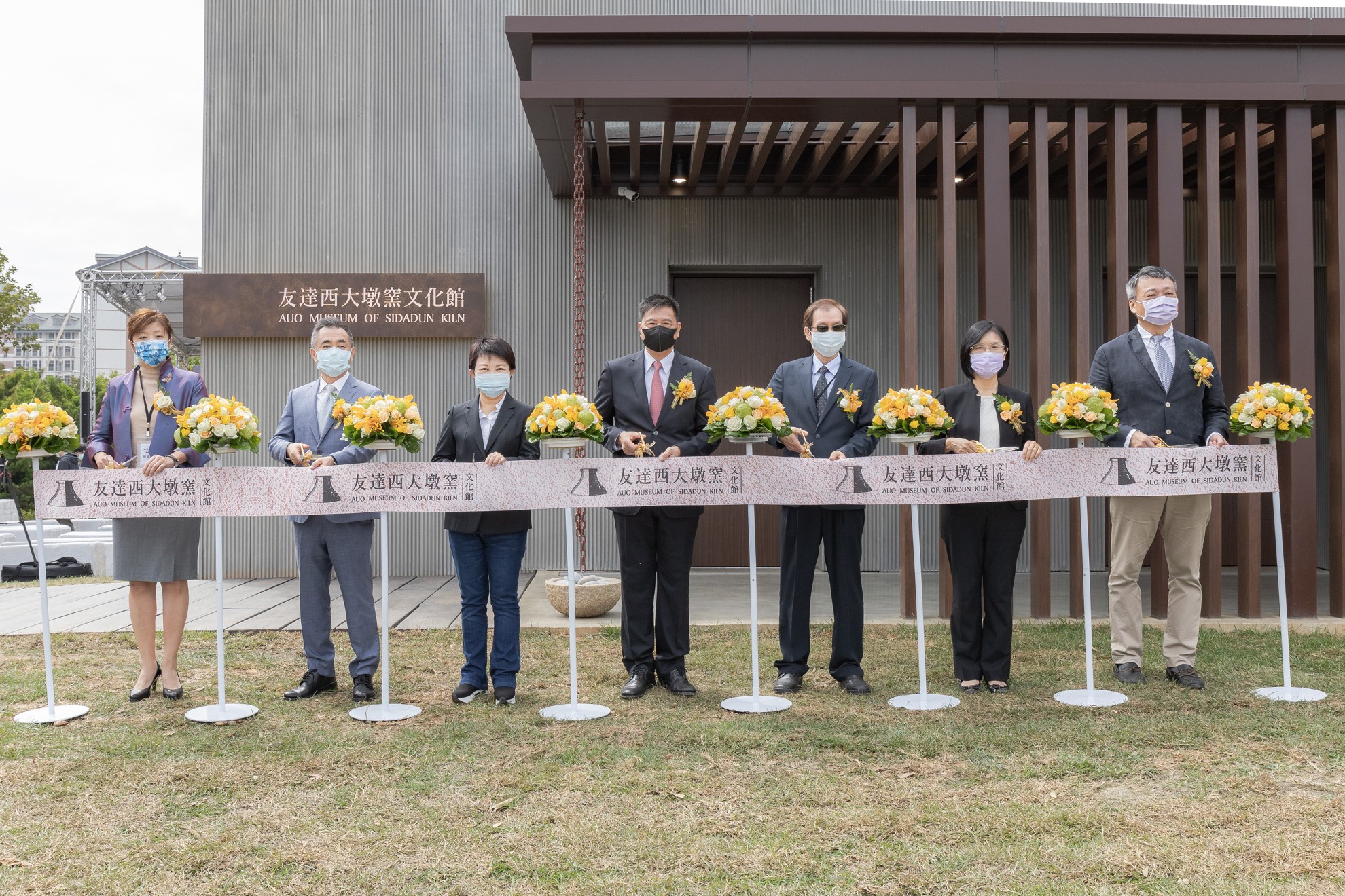 友達西大墩窯文化館開幕剪綵儀式 (左到右:十匯建築師陳嘉蕓、互助營造股份有限公司董事長林志聖、臺中市市長盧秀燕、友達永續基金會董事長彭雙浪、中科管理局副局長許正宗、友達永續長古秀華、卡爾吉特總經理劉永明)