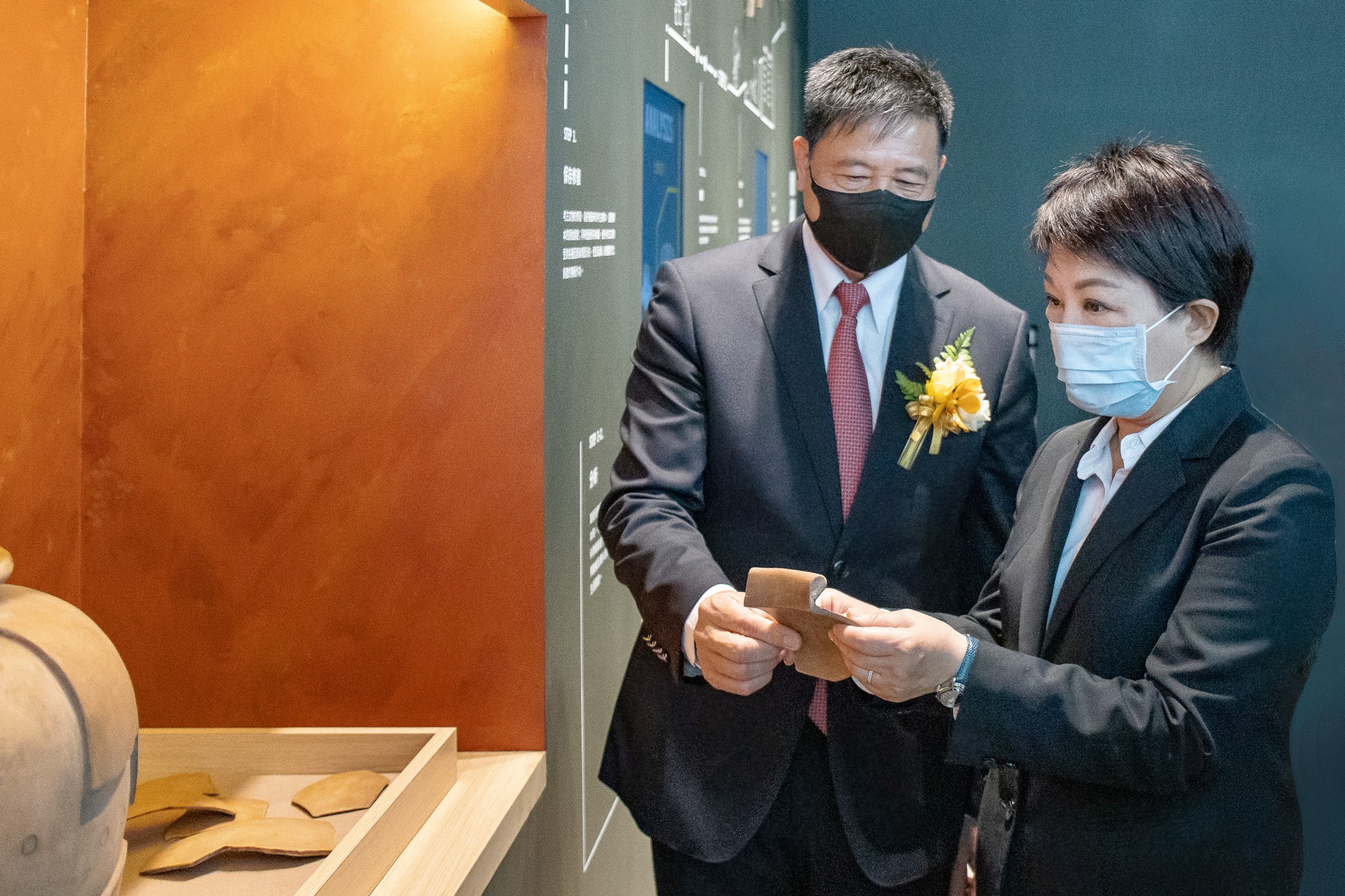 臺中市市長盧秀燕 (右)蒞臨友達西大墩窯文化館,友達光電董事長暨執行長彭雙浪 (左) 陪同參觀