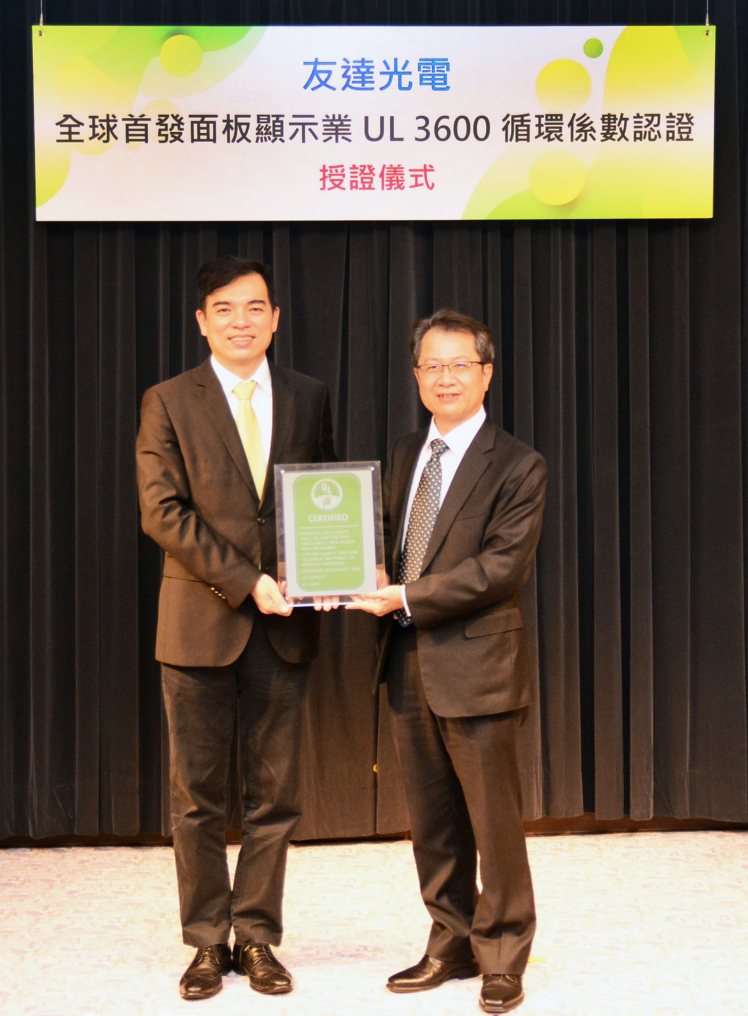 友達(dá)取得全球首張面板業(yè) UL 3600 循環(huán)係數(shù)認(rèn)證,由UL全球副總裁暨臺(tái)灣總經(jīng)理陳宗弘 (右)、友達(dá)總經(jīng)理暨營(yíng)運(yùn)長(zhǎng)柯富仁 (左) 進(jìn)行授證儀式。 |